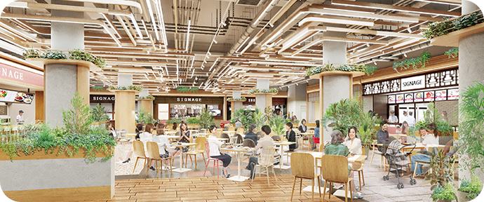 公園に隣接し、包み込むような森をイメージした天井が高い大空間に、約1,000席の客席とその客席を囲むように22の店舗が配置されています。新業態、埼玉県初、所沢市内初をはじめ、地元フード、和洋中、アジアンフード、デザートなど人気の店舗が軒を連ねます。