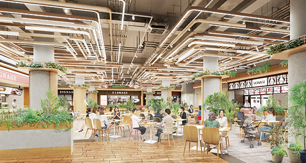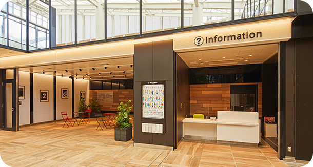 大型サイネージやWi-Fiなどのデジタル設備を完備しながら、シンボルツリーを中心に緑が溢れ、吹き抜けから自然光を取り入れた開放的で多目的なオープンエアーの空間を提供します。さまざまな情報を提供する大型サイネージやパンフレットラックを設置し、地域の情報発信基地としてインフォメーション機能を担います。また、併設するイベントスペース(45 m²)では、エリアの魅力を発信する行政イベントやテナント催事なども開催しています。