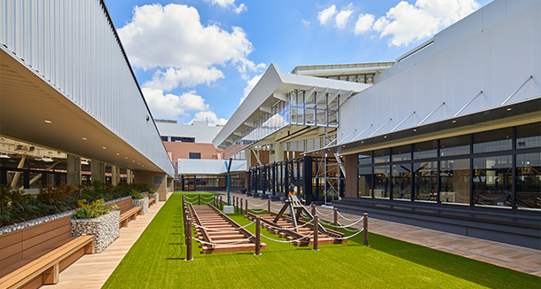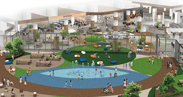 4階には屋内外がシームレスにつながる広場「そらくもひろば」が誕生いたします。屋外部分には、ポップジェットや築山などの遊具を配置し、お子さまにのびのびと遊んでいただけるほか、グリーンやベンチを配置し、散歩や休憩などのくつろぎのひとときも提供いたします。